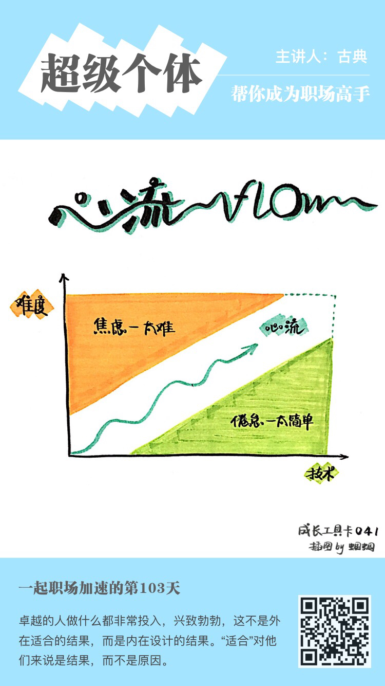 设计心流通道 如果说学习是一个完全可以自控的过程,工作则比较难控制——因为任务的内容和难度都不是你设计的。你需要在完成工作任务的前提下找到心流,这就需要你的内在设计。 你需要持续调整难度与挑战的关系。 如果工作难度比较高的时候,第一步不是动手做,而是学会寻找方法论,把大目标拆解到自己能控制、能自我反馈的小目标开始。 好的方法论一定是你自己就能即时评估和评价的,也就是佛门说的“法门”。一万小时理论虽然不一定学术正确,但至少给希望成为专家的人一个楼梯入门,我100小时了,我500小时了。等你真到了7000小时,其实你已经充分理解真正高手的标准,无需这个楼梯了。 当工作难度太低,尝试给自己设定成长型突破 我在新东方讲课的时候每天10小时、4节课、连续60天,非常倦怠。于是把讲师技能比如“讲笑话”、“让人哭”、“语速快”、“讲故事”……列了10个项目,每天专门练一门。循环6圈,快快乐乐过了暑假。 很多人认为不投入是因为工作不适合自己,我在新年趋势一文谈过——工作越来越多的是一件事,而不是一个组织或固定职位(见文章11-1)。 卓越的人做什么都非常投入,兴致勃勃,这不是外在适合的结果,而是内在设计的结果。适合对他们来说是结果,而不是原因。