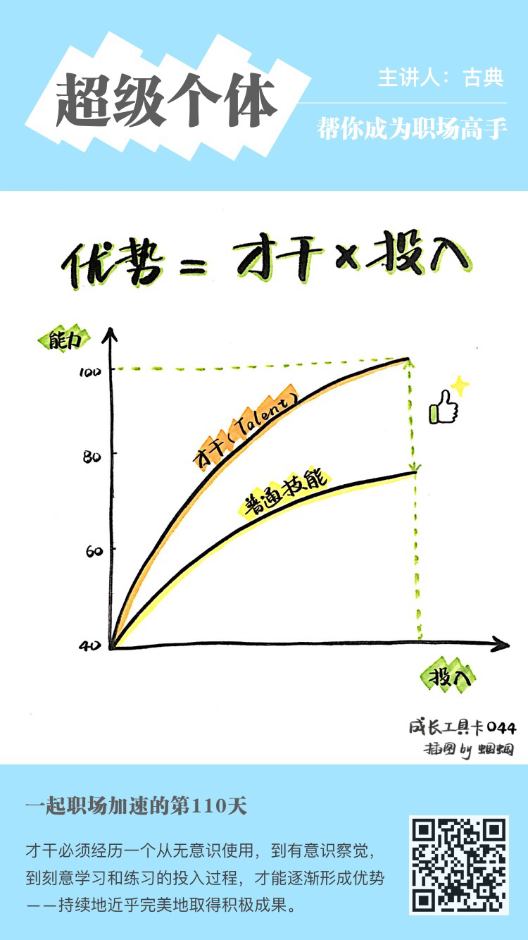 - 第三步,能够利用:围绕先天的才干,持续的扩充专业知识、学习技能,固化成能力。