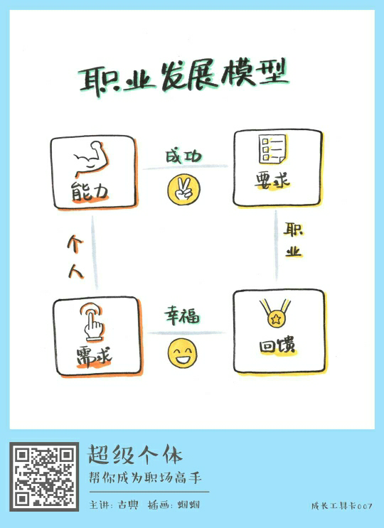 - 职业发展模型和职业发展4要素:个人能力,个人需求,职业要求和职业回馈。这四者共同构成了一个人的职业满意度,成功度和幸福度,那么你可以通过几个问题,确认自己在哪个部分可以有所提升。