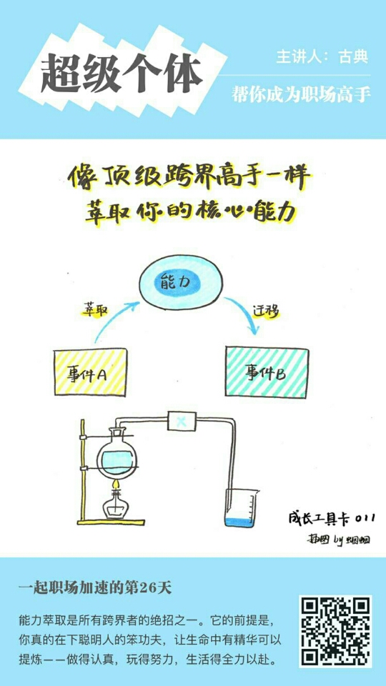 根据这些思考,把自己一段经历中的能力“萃取”出来,作为自己的能力标签,发到朋友圈,还可配上今天的工具图。