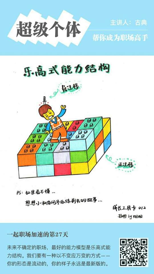 - 如果你是一盒乐高积木,你会修炼哪三种能力作为你的核心模板?对照下面这个可迁移技能表,试试看拼一个最喜欢的自己。
