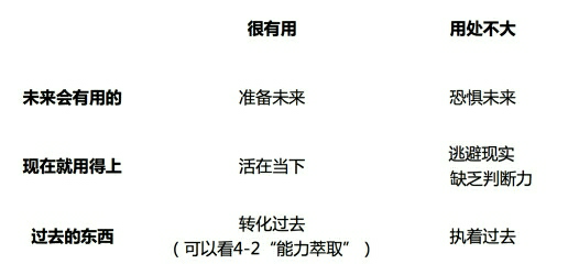 通过观察你身边占用时间、空间、注意力最大的10个物件,你可以评估一下自己的心智模式——然后逐一判断这些物件落在哪个领域。下面是一个按照“时间—有用程度”排列的表格。