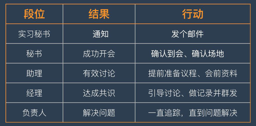 你的结果思维到底如何? 可以做一个测试:假如领导吩咐你,要你组织大家明天下午开场会,你会怎么做?做什么? 先不着急往下看,思考下你会具体怎么做? 毫无结果思维的人会仅仅发一封邮件通知大家,来不来不知道。他看到的指令是 “通知” ,没想过什么结果。 一级结果思维的人会发完邮件,然后预定会议室,他看到的结果是 “会议能按时召开” 。 二级结果思维的人除了发邮件、预定会议室、打电话跟每个人确认,还会发给大家议程,准备会前资料。他看到的结果是 “会议召开,准备充分能达成共识” 。 三级结果思维的人除了做完前面的事,还会积极地引导讨论,形成会议记录,并且群发给更多人。他做出来的结果是能 “交付和传播” 的。 真正的高手,他看到的结果是会议背后的结果—— “解决问题” ,他会一直跟踪到事情解决,不行就再开会。这已经是领导者做的事情了。 对于结果不同程度的追求,决定了这个人的身价。