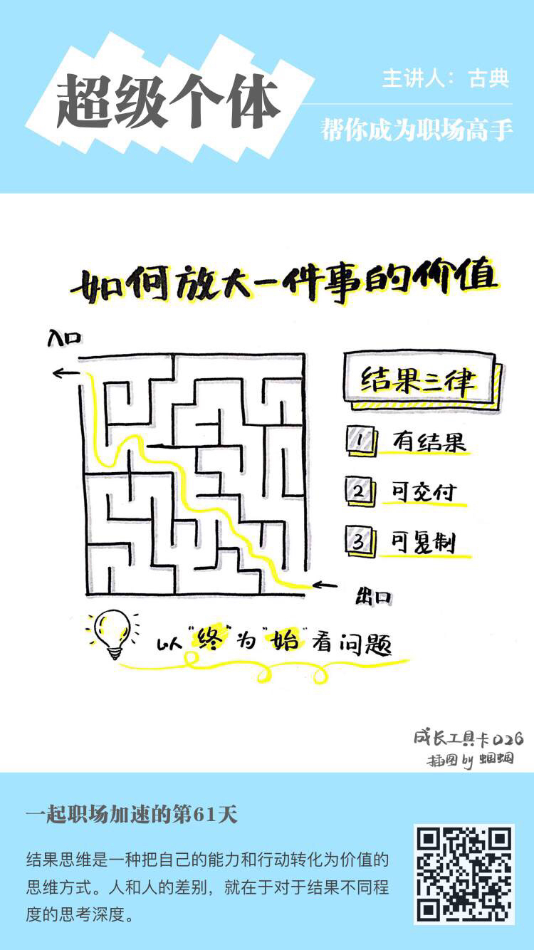 昨天我们分享了最简单的自我管理工具,每天记录、发布和检查自己的三件事。很多人说,就三件事啊,不过瘾。今天我们来讲一个“三件事”背后的心法—— 以终为始的结果思维 。