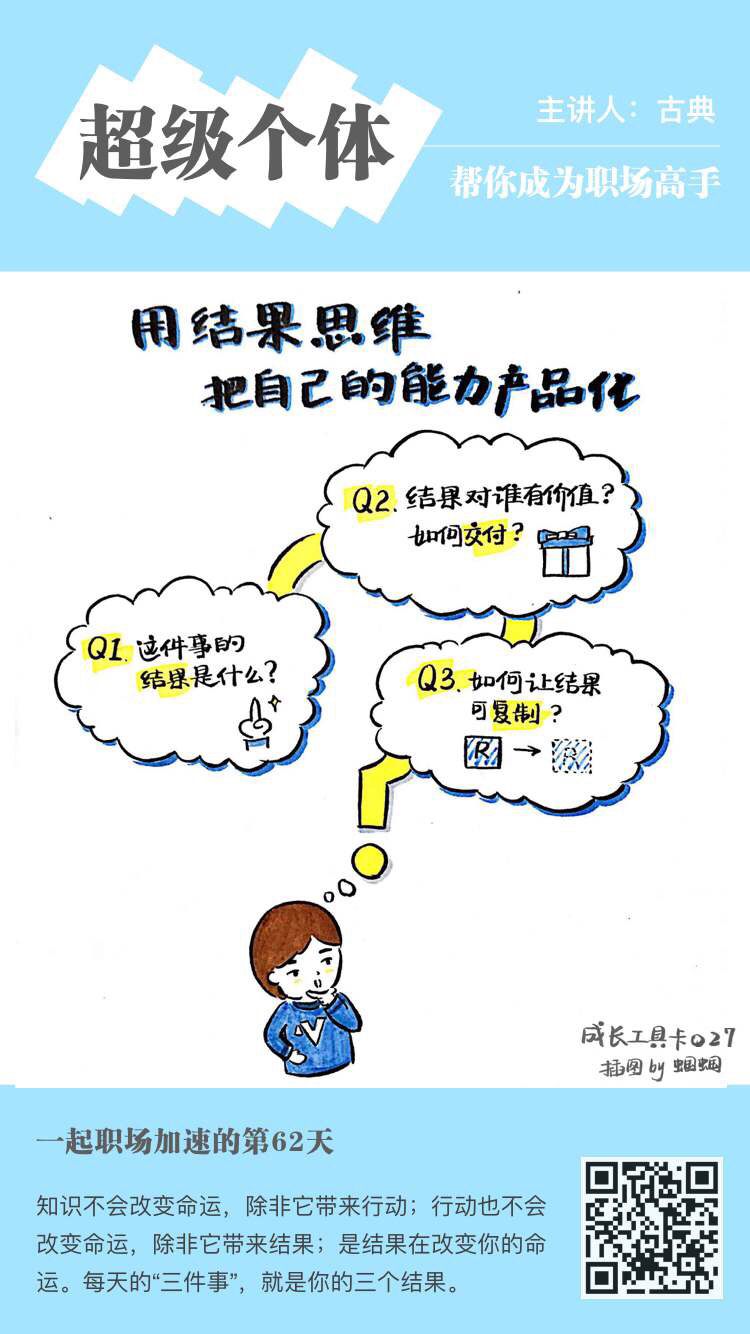 - 超出预期:尽可能地超过别人的预期一点点。就是这一点点让人永远记得你。 创业中的结果思维修炼 现在把你的结果思维提高一个层面,想象一个“第二职业”的案例。 假如你现在发现自己有一个能力——特别喜欢也擅长手绘,于是你在你的三件事里写“每天画一幅手绘”。但是——你现在知道了,这仅仅是一个行动。我们用结果思维升级一下。 首先要问自己的是结果第一律:“手绘的结果是什么?” 如果是开心,那么这是个兴趣,不管画成什么样子,快乐就好。 但如果是有价值,那么结果必须是“画出一幅完整的手绘作品”。 然后问自己第二个问题:“谁会需要这个结果?我要交付给谁?他们觉得什么有价值?” 这是结果第二律:结果能交换。 你很快会意识到仅仅是好看、表达点儿自己的碎碎念是没交换价值的(很多人的公众号也是这个问题啊)——除非你本身已经被很多人关注了。手绘的价值是能迅速传递文字无法传递的信息,而且更加形象和美丽。简单说,手绘传递的信息和情感才是可交换的。 进一步,你发现年轻的女性特别喜欢你的画风,这些人同时也需要关于“心理、个人成长、理财、美妆”等一系列的价值。而你很喜欢心理方面的内容。 你的结果升级成: “每天坚持画一幅对女性有帮助的、心理相关的手绘。” 为了超出大家的预期,你在每一幅画下面,还手写了一句非常暖心的话。你向用户征集自己的“暖心小语”,也在卡片上写上他们的名字,互动就建立起来了。 最后你问自己的问题是结果第三律:“有什么方式能复制和放大这个结果?” 刚开始的时候肯定是扫描成图片,发到微博,然后逐渐让喜欢的人养成习惯去微信天天刷。 如果一旦有了规模,可以和出版社合作,给心理学图书画手绘图解——这样复制的是知识来源问题;可以设计几个固定的人物形象——这样复制的是每天的人物设定问题;还可以联系几个固定的渠道发布——这样复制的是传播途径 …… 从“我要画手绘”这件事,到“用视觉传播有价值的信息”的自媒体IP的结果。其实需要的,也是“外包思维”和“结果三定律”的层层深入。 对于自由职业者、多重身份或者创业者,持续地问这三个问题,让你做事情更有穿透力和价值感: